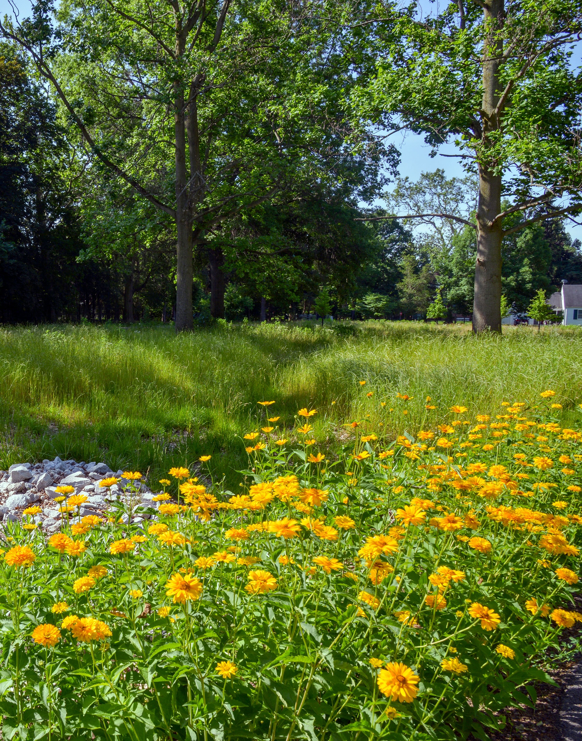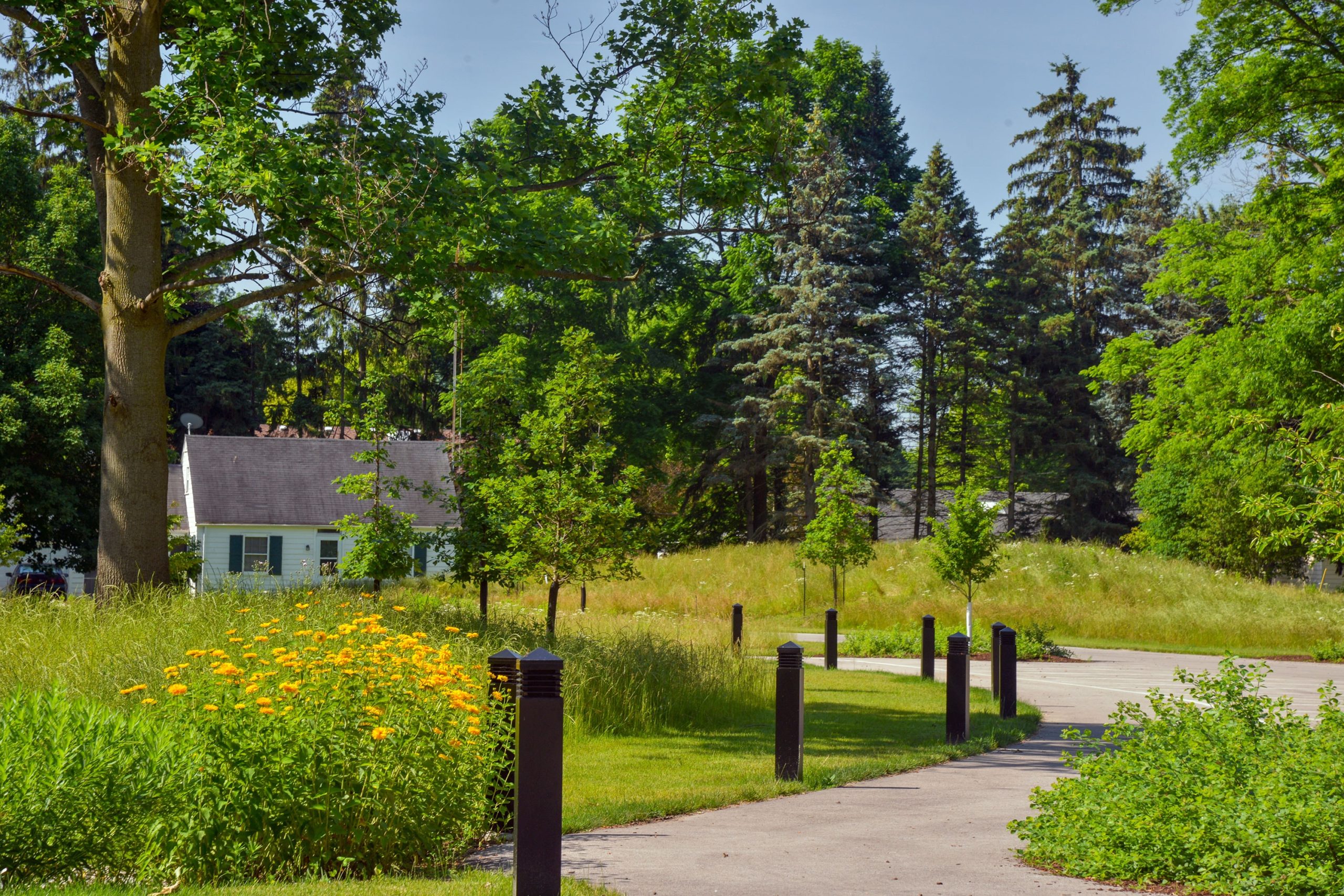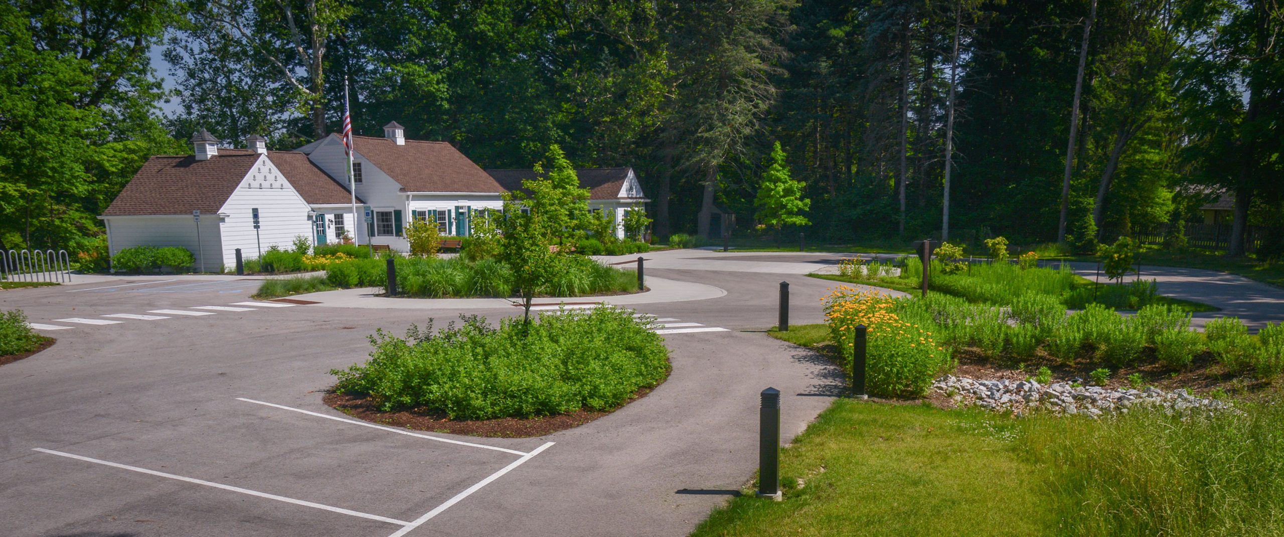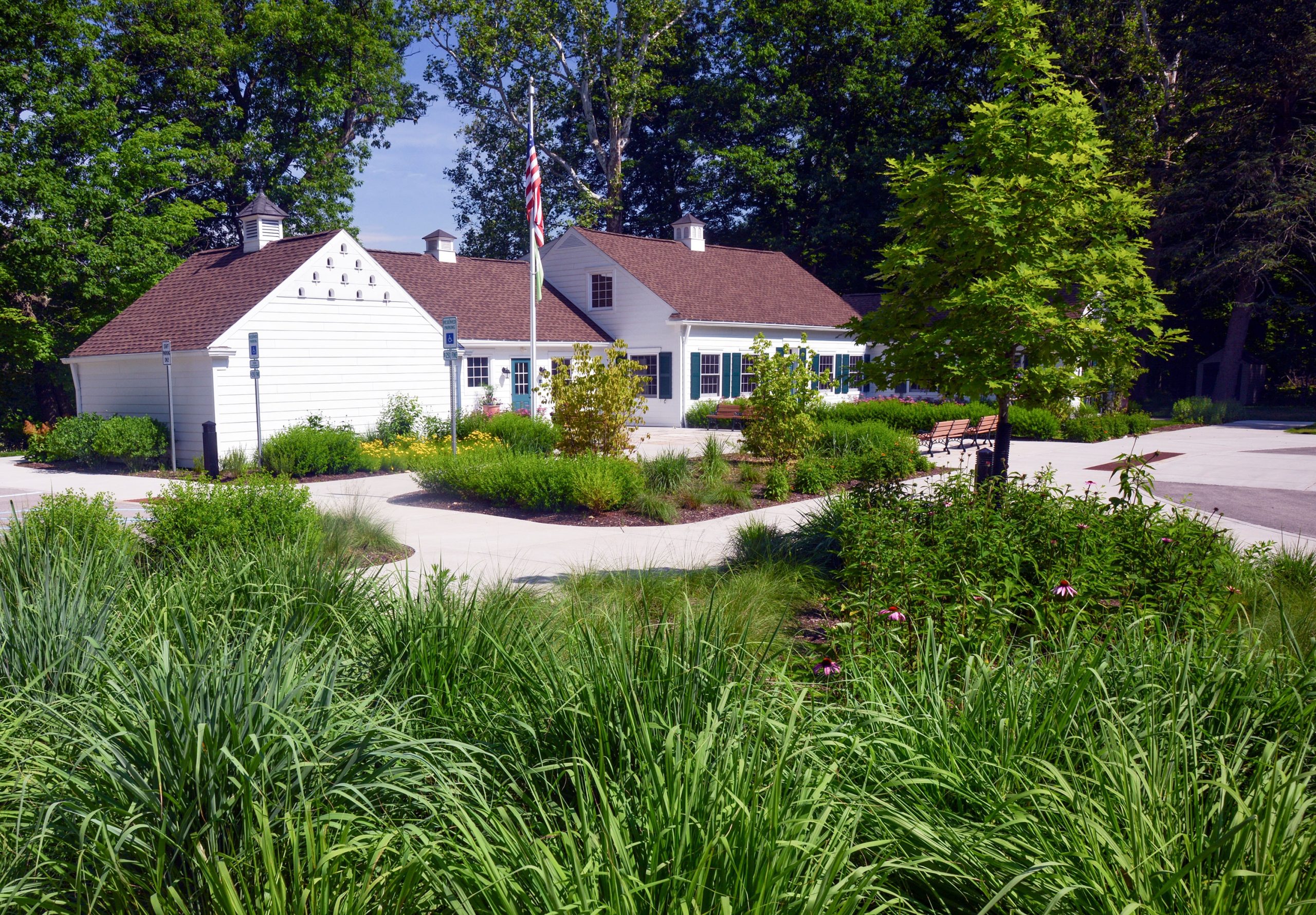 The initial phase of improvements focused on enhancing circulation through the site, including a new entrance drive and accessible drop-off loop, a pedestrian entry plaza, and parking for 30 cars. The restoration of 1.9 acres of lawn to natural meadow and the creation of a bio-retention system for water runoff were established to blend into the adjacent Preserve and improve the water quality of Swan Creek.