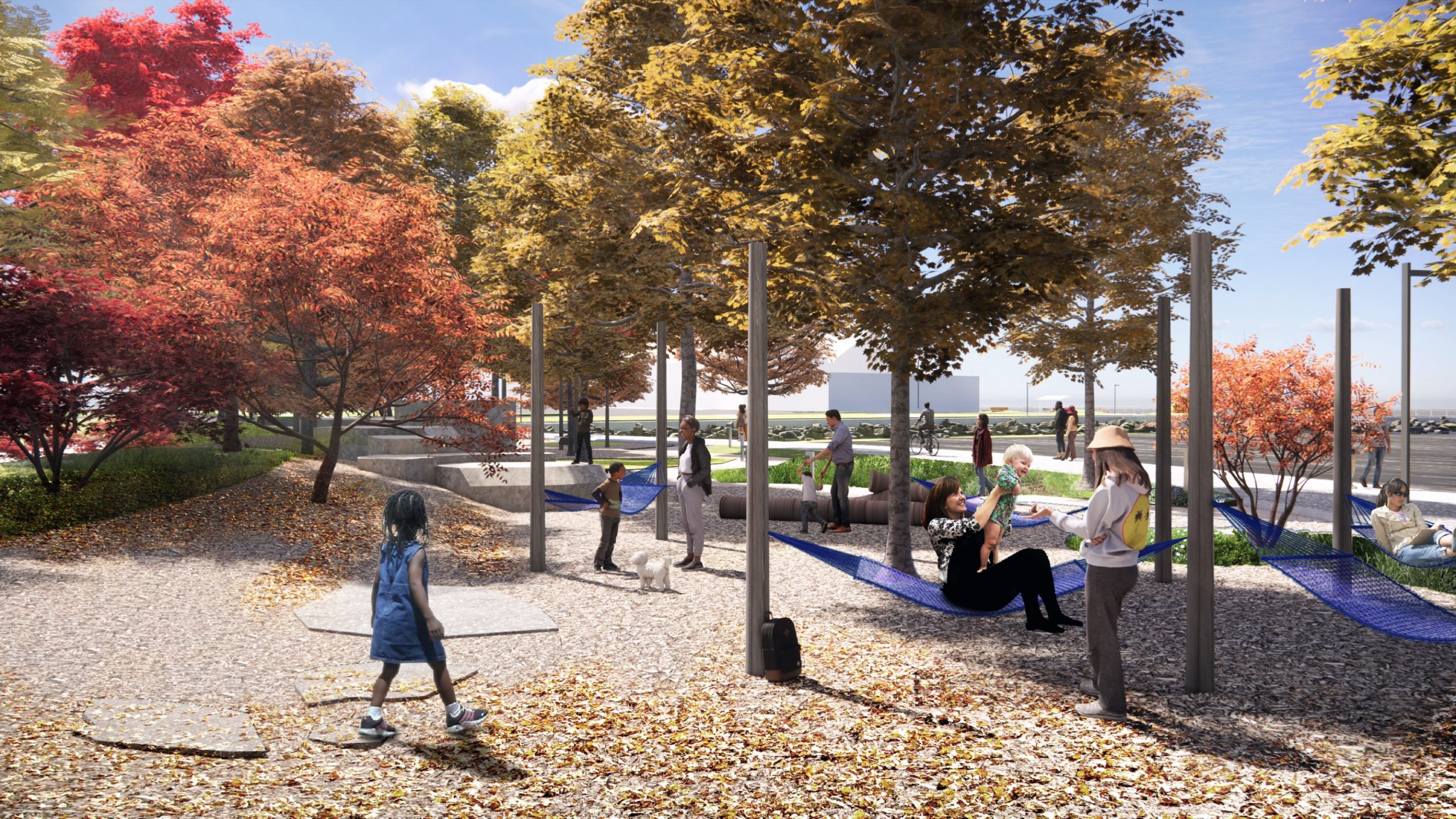 - A large multifunctional lawn provides space for play and public gatherings, and can be used for community gatherings such as outdoor movie nights. The oval lawn lies at the center of concentric pathways, drawing people through the space.