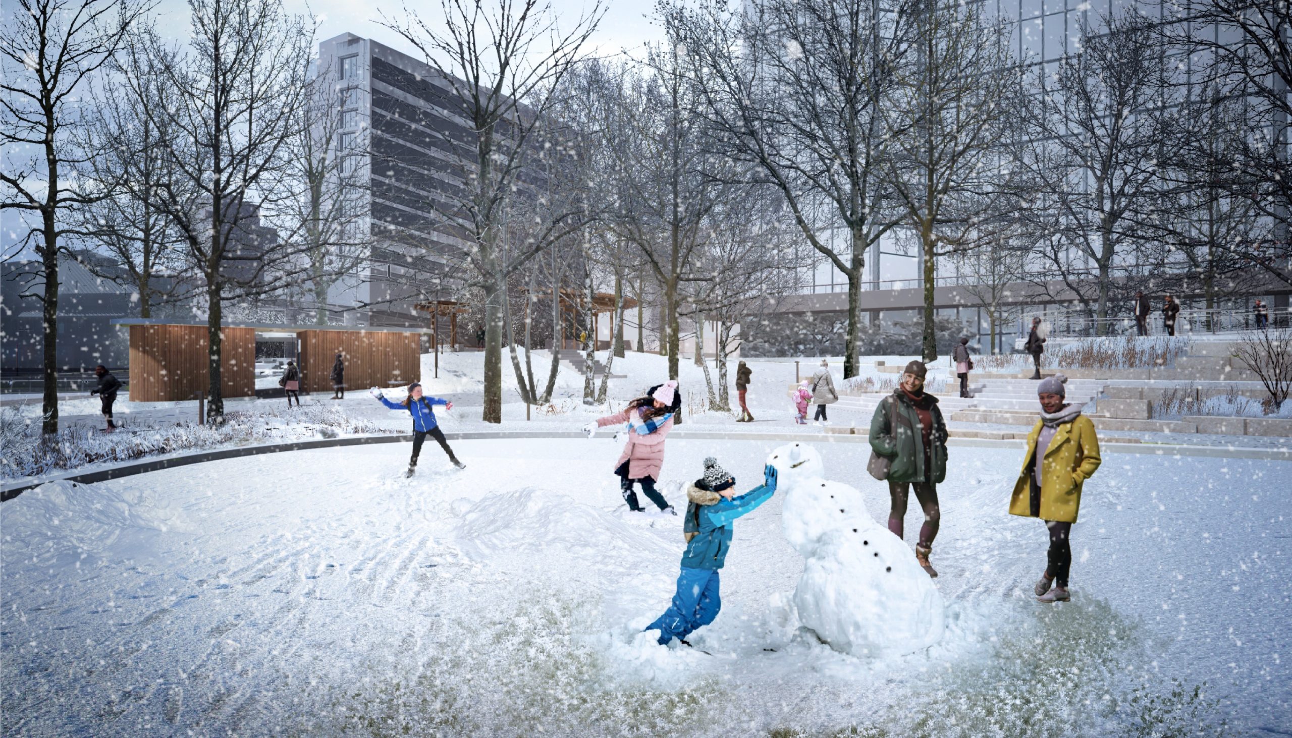 - A large multifunctional lawn provides space for play and public gatherings, and can be used for community gatherings such as outdoor movie nights. The oval lawn lies at the center of concentric pathways, drawing people through the space.