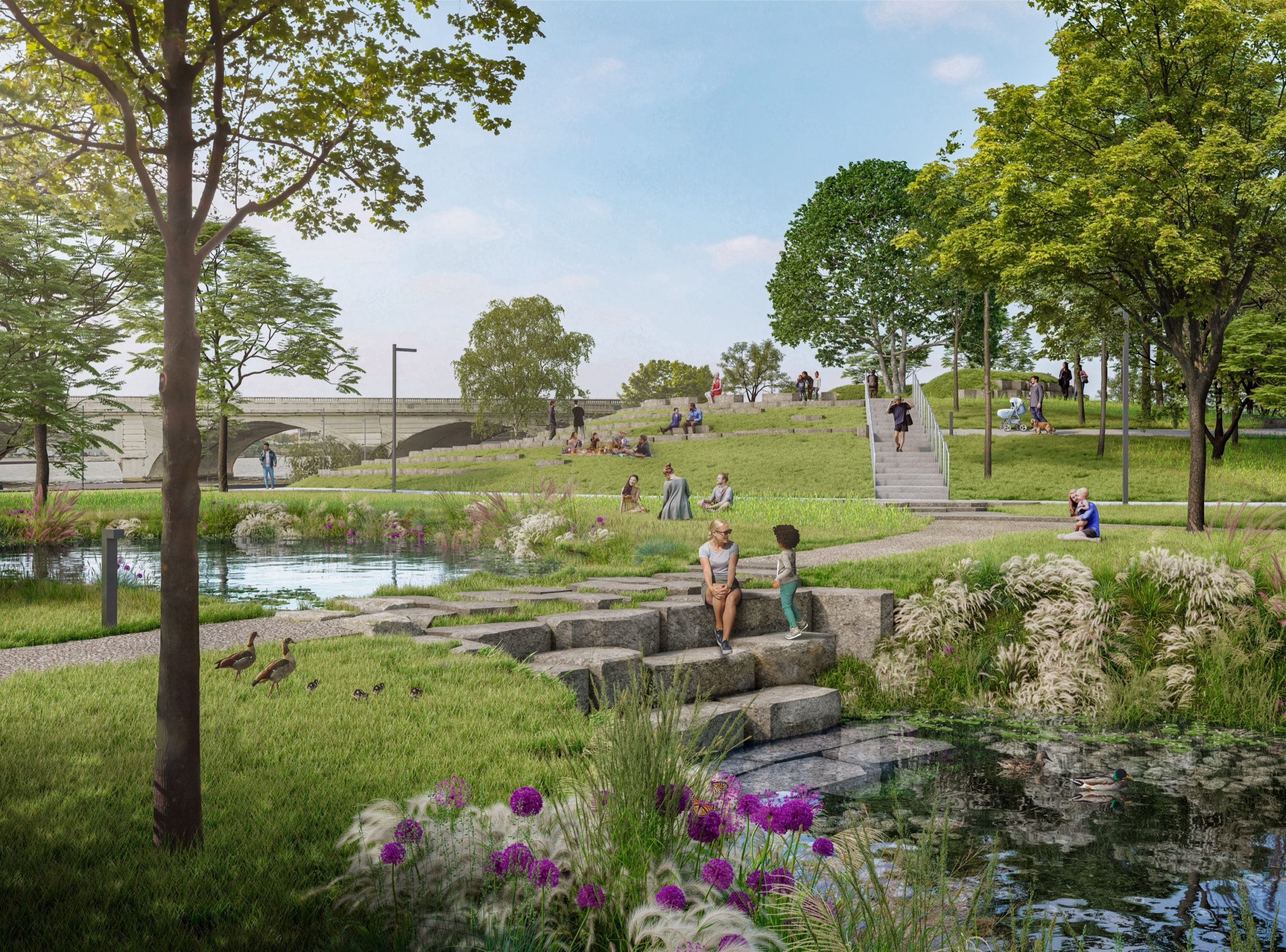 In partnership with WXY, has transformed 53 underutilized acres of open fields, mature woodlands, and scenic meadows along the riverscape as a segment of the Glass City Riverwalk development. This urban metropark provides equitable access to engaging recreational elements, including: