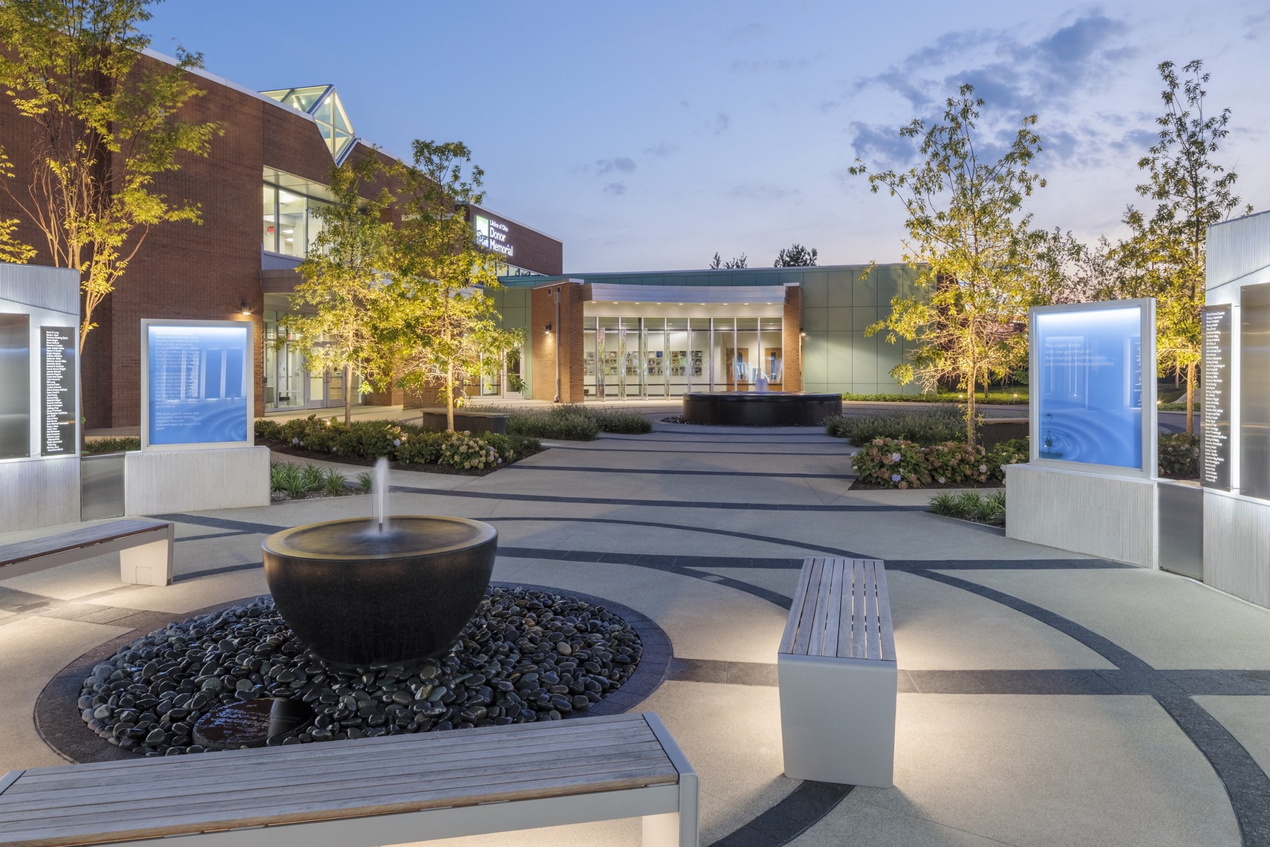 The theme of the ripple effect was carefully articulated throughout the memorial in the form of water, the pattern of pavement, landforms, plant materials, walls, and architecture. On axis with the main entry is a Central Fountain that serves as the source of the ripple that radiates through the landscape. The ripple influences the architecture of the headquarters building with a curved façade and patterns in the floor and ceiling planes.