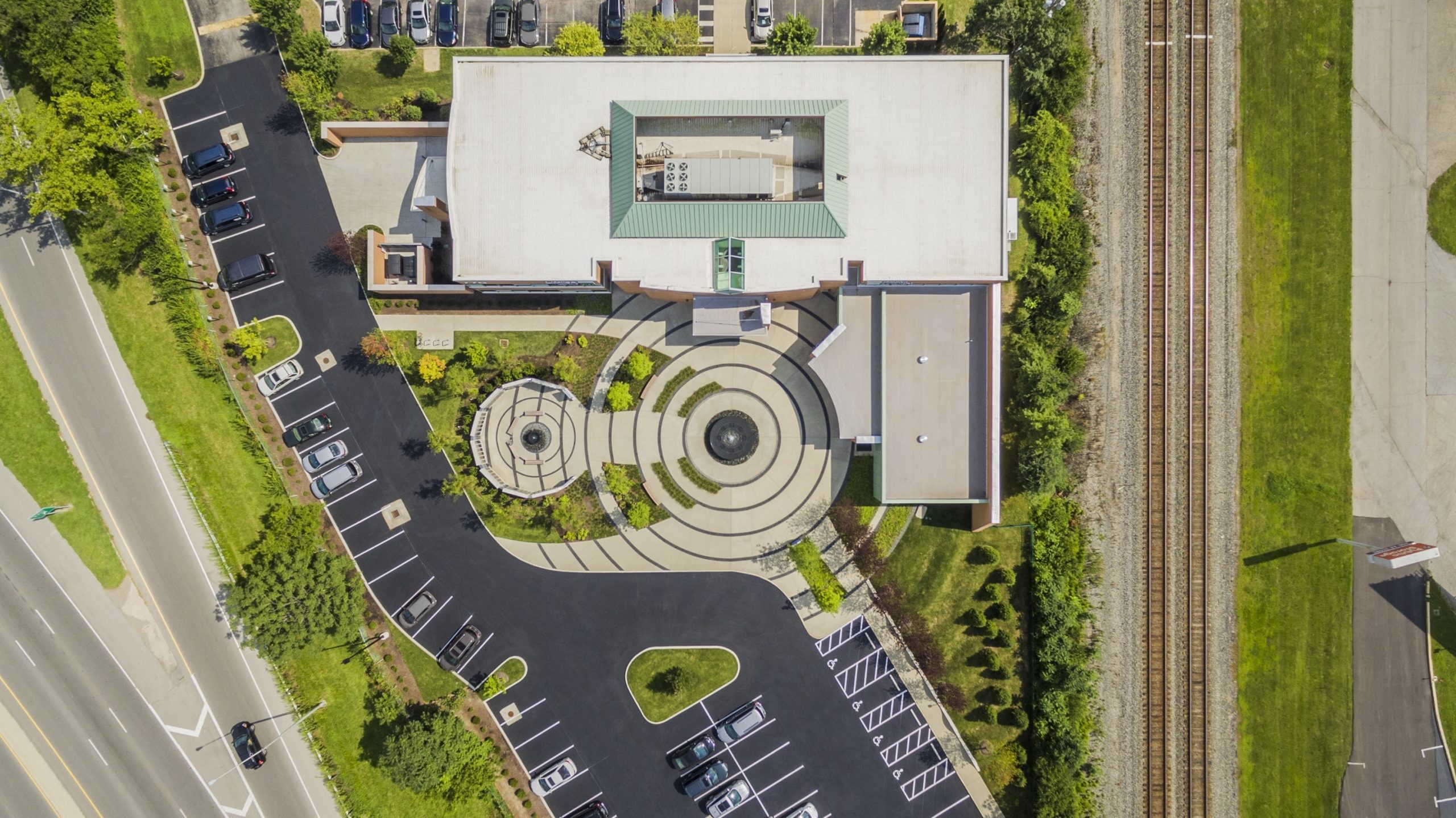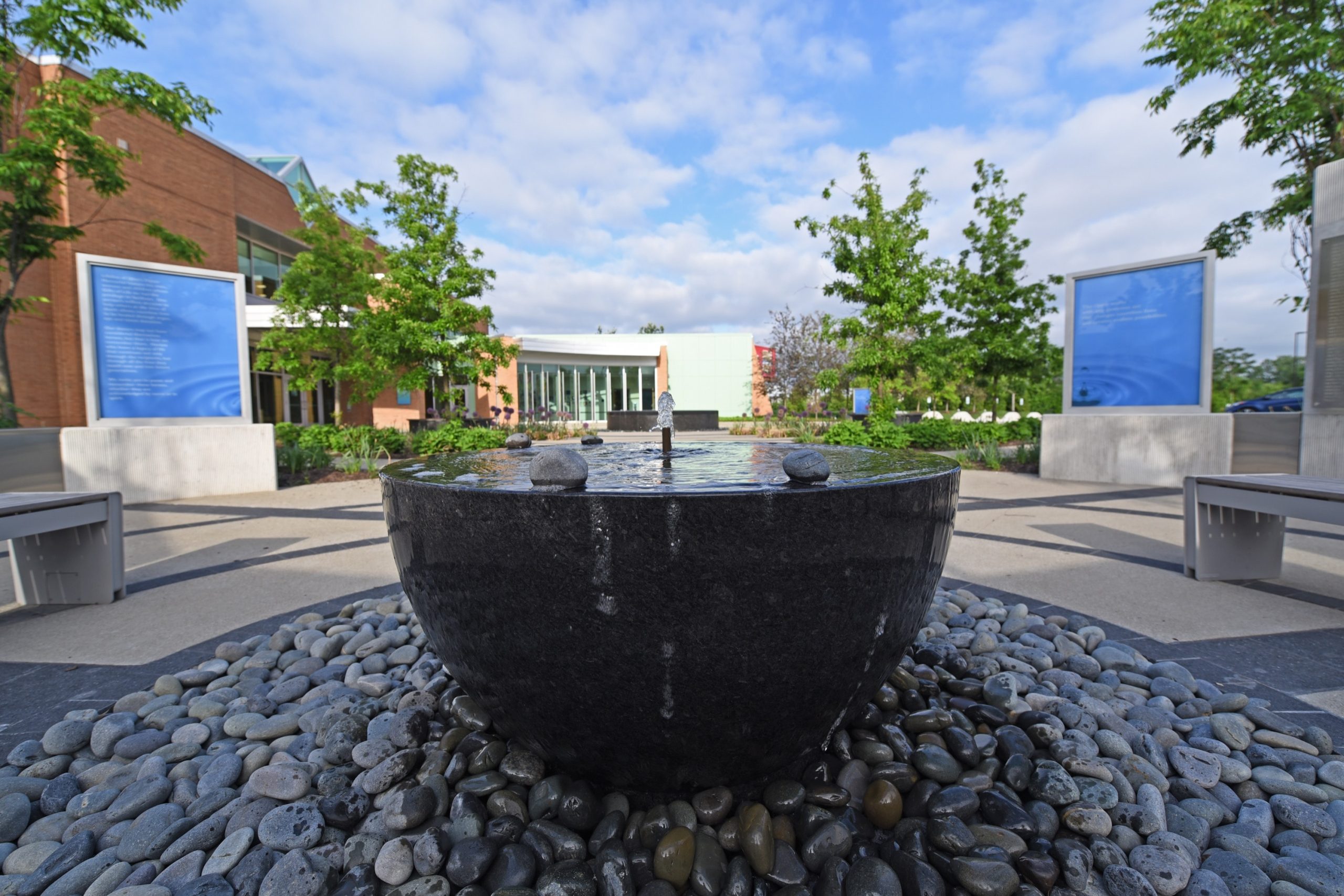 The theme of the ripple effect was carefully articulated throughout the memorial in the form of water, the pattern of pavement, landforms, plant materials, walls, and architecture. On axis with the main entry is a Central Fountain that serves as the source of the ripple that radiates through the landscape. The ripple influences the architecture of the headquarters building with a curved façade and patterns in the floor and ceiling planes.