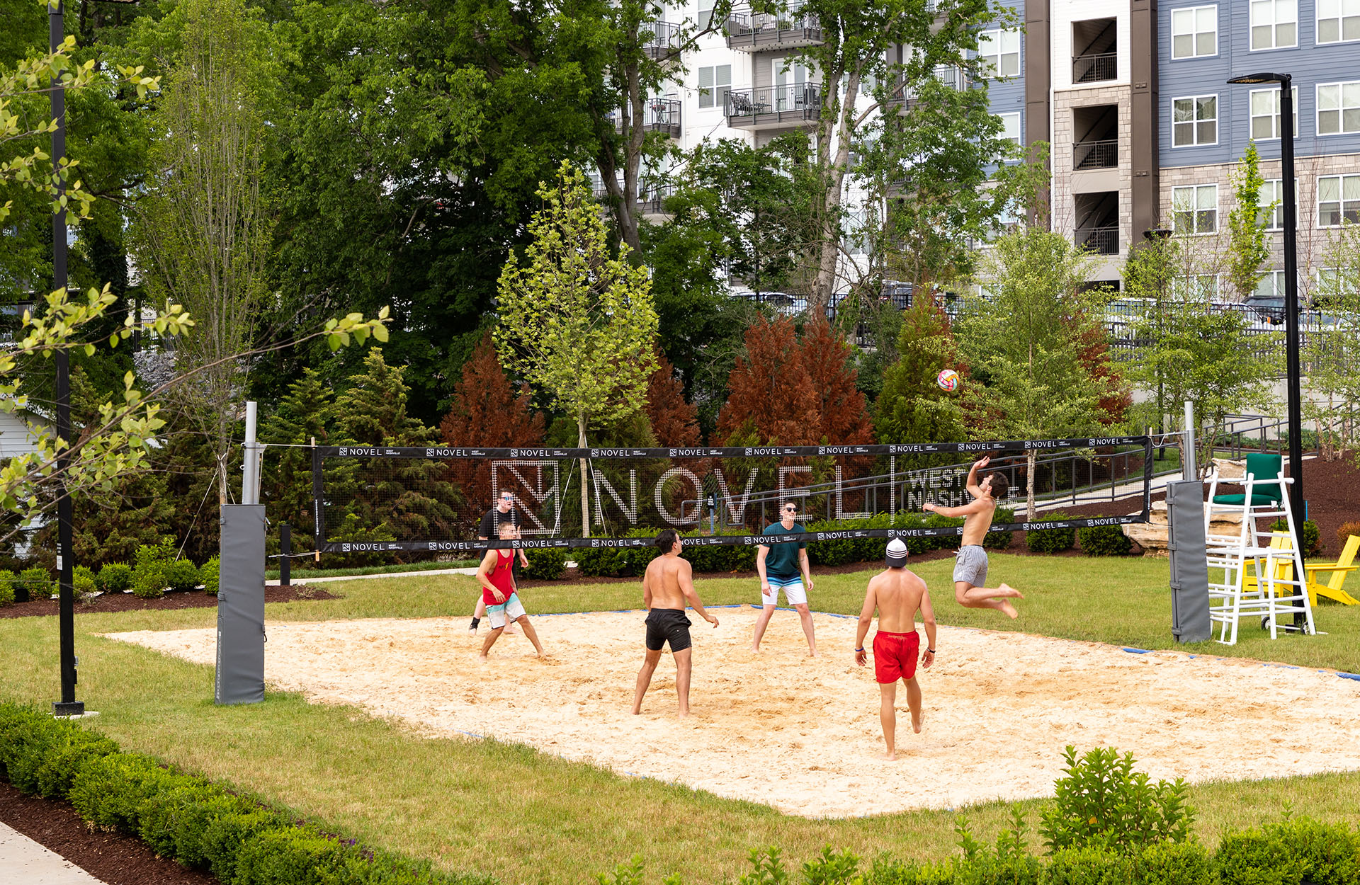 The landscape also supports the active lifestyle at the heart of the NOVEL vision, with a sand volleyball court, cornhole, open lawn, and shaded greenspaces woven throughout the property. ADA-compliant pathways integrated with lush planting beds ensure accessibility without sacrificing the site’s visual appeal. With luxury materials, tasteful plantings, and intuitive circulation from entry to parking, every element contributes to a modern lifestyle that feels elevated without feeling out of reach.
