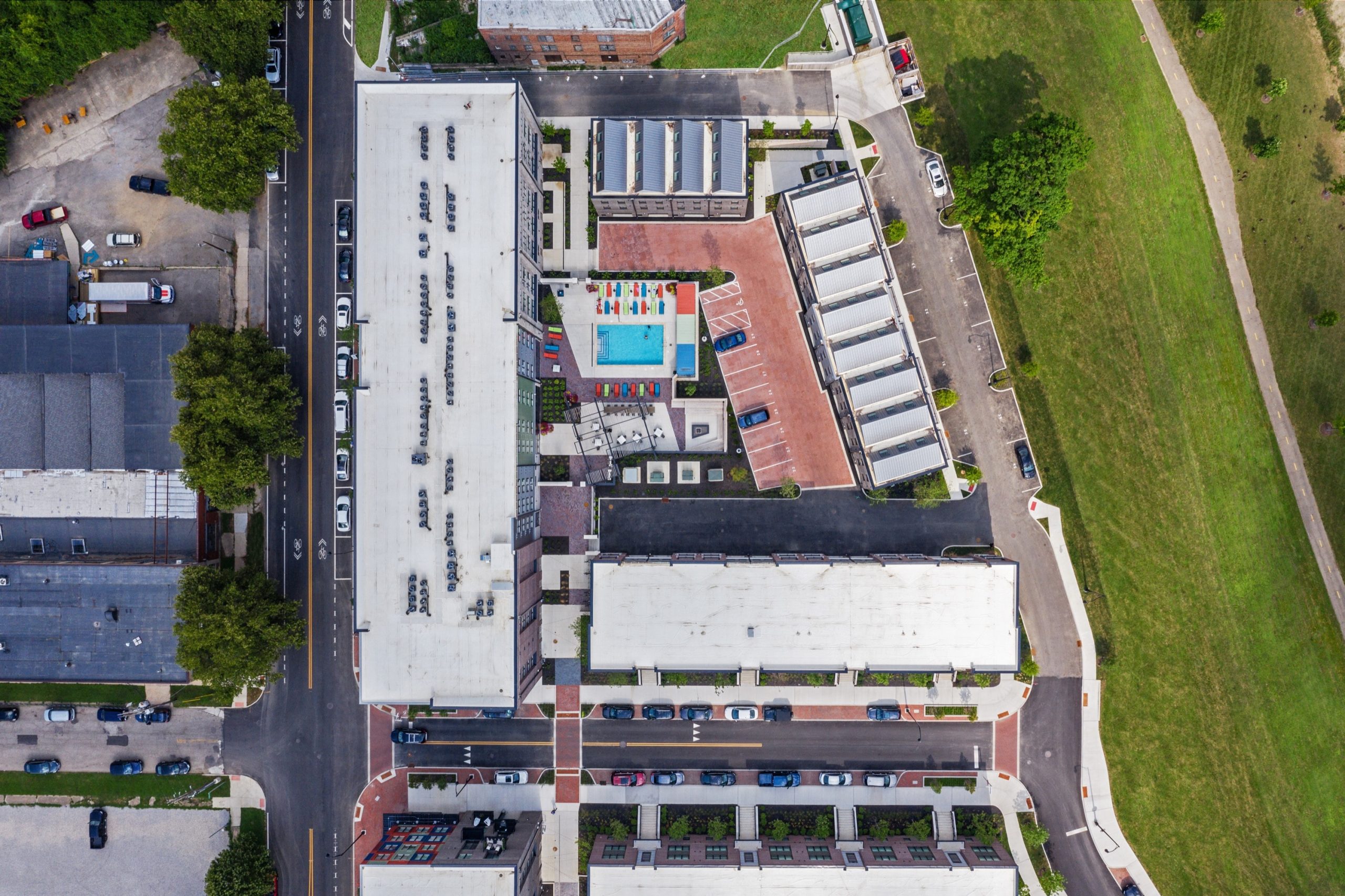 East Franklinton is a 200-acre mixed-use district immediately west of downtown Columbus. In recent years, it has seen a resurgence in development. As a part of continuing reinvestment in this community, EDGE planned, designed, and documented a new six-acre development along the Scioto River featuring a mix of residential and live/work units. Working with the developer, engineers, and architects, EDGE developed a phased master plan to maximize the efficiency of units and parking while mitigating the nearby railroad tracks and river levee.