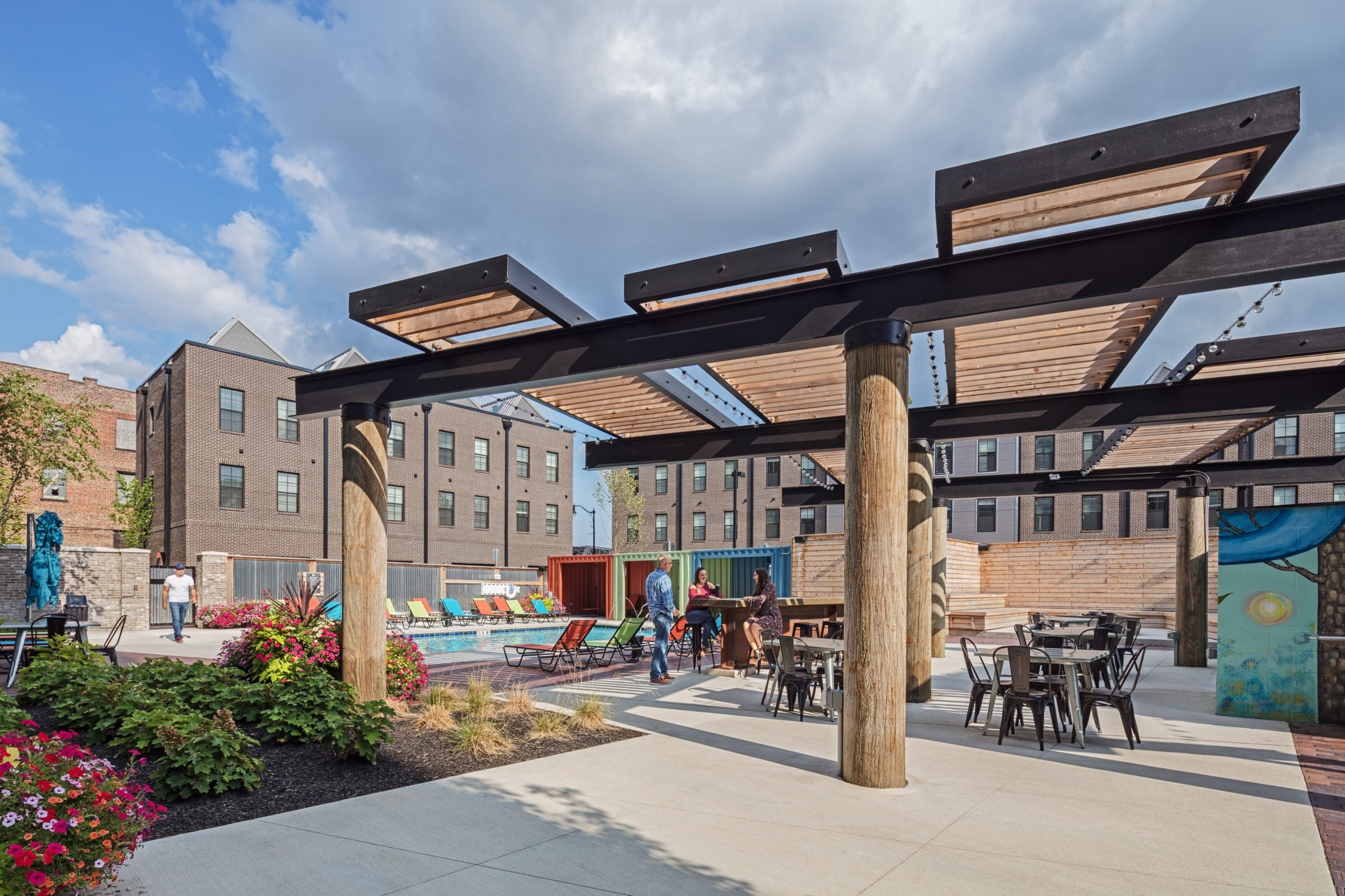 Keeping with the arts and innovation theme of the existing neighborhood, the development features a sequence of cohesive spaces within the site, including a mural-covered pedestrian alley, a series of small private outdoor lounges, and a unique industrial-themed amenity area for residents. The surrounding public streetscapes were specifically designed to blend into the neighborhood, complementing the raw, artistic vibe of the formerly industrial area.